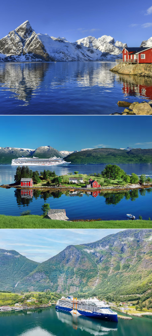 Classic fjord cruise destinations include Bergen, Geiranger, Flåm, Ålesund, Hellesylt, Innvikfjorden, Nordfjord and Olden. Many itineraries also include stops in Copenhagen, Kiel, Reykjavik and even Zeebrugge.