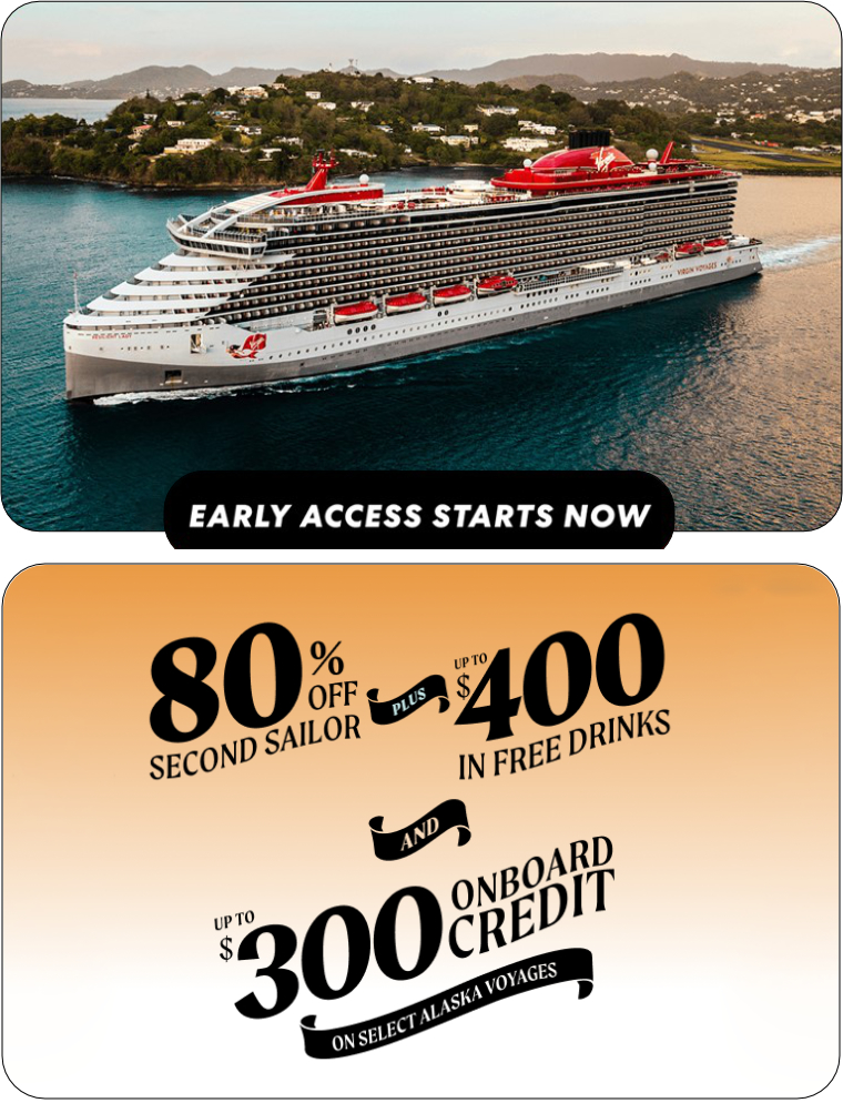 Get 80% off your second sailor + up to $400 USD in free drinks on all voyages (and all ships) through 2027 plus up to US$ 300 on board credit on select Alaska voyages.