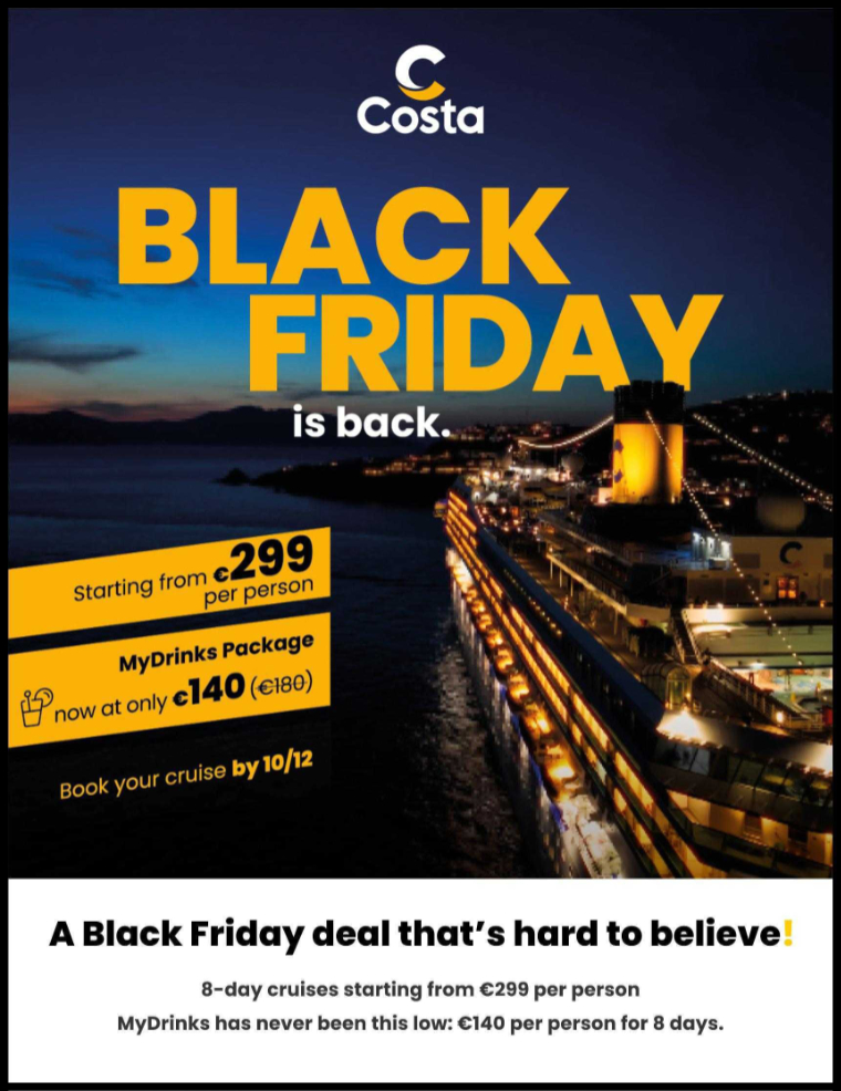 Costa Cruises has announced a Black Friday Sale with 8 day cruises starting from just Euro 299 per person. What’s more, get My Drinks Package for Euro 140 person for 8 days cruise. The Black Friday Offer is valid for bookings made between 06 Nov and 10 Dec ’25 for select sailings from November 2025 to July 2026