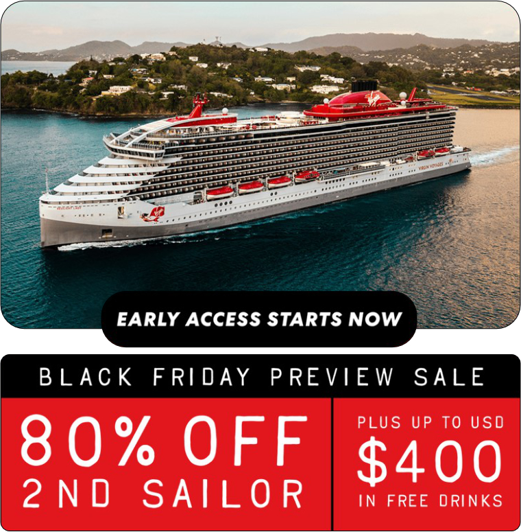 With Virgin Voyages’s Black Friday Sale, get 80% off your second Sailor + up to $400 USD in free drinks on all voyages (and all ships) through 2027.